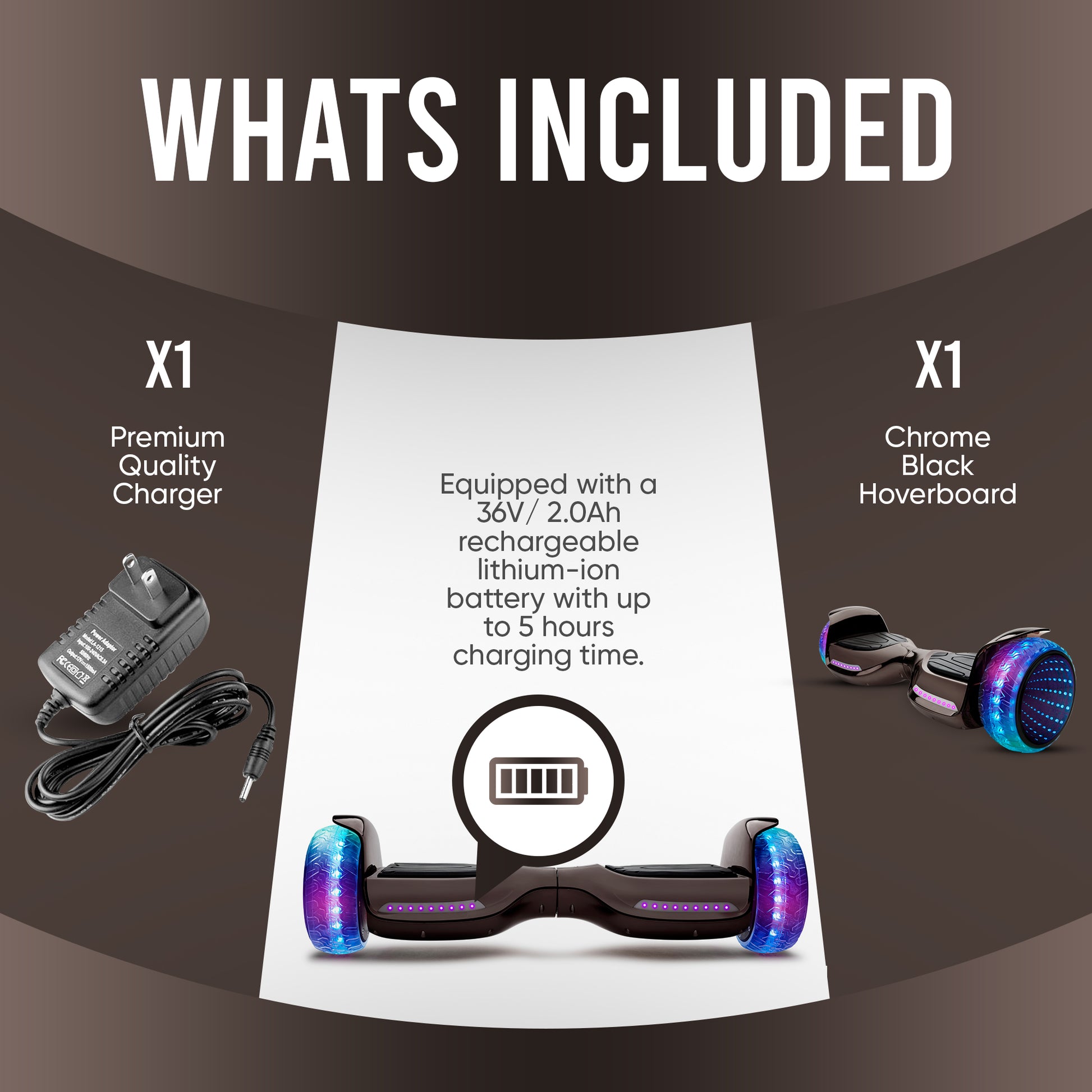 ✅LONG LIFE BATTERY - This hoverboard has Long-lasting 36V/2.0Ah lithium-ion rechargeable battery (charger included), providing you satisfied riding experience. Hoverboard can be fully charged in 6 hours.